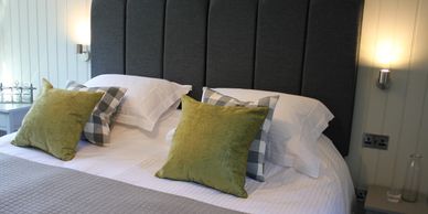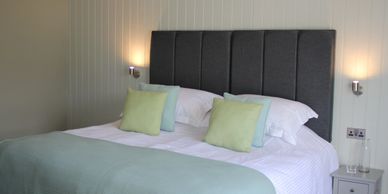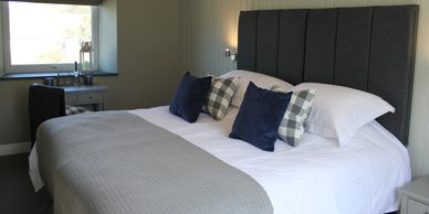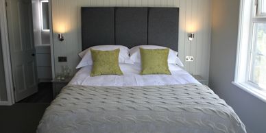 Bedrooms are located on the first floor with access via stairs from the ground floor. Each is named after a local shoreside village or location. Beds are superking or king-sized with some having the option to be configured as single beds on request. Mattresses are pocket-sprung and beds are dressed in high-quality Egyptian cotton linen. Wool carpets and heavyweight roman blackout blinds add to overall room comfort. A non-smoking policy applies to all guest rooms.